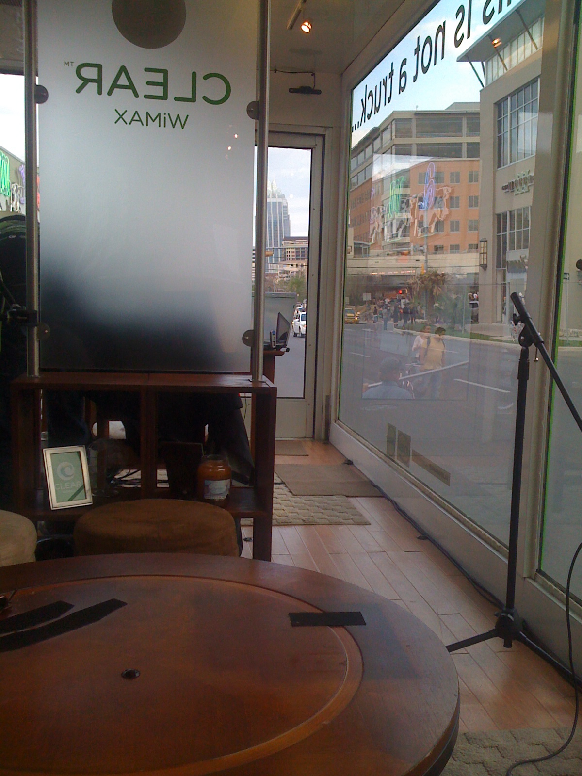 While I was in Austin I did a few interviews for the Clear Mobile Network live TV coverage of SXSW. What I didn’t know going in was that the studio was a giant plexiglass room on the back of a truck that would drive around Austin while I did my interviews. It was a surreal experience. During one hard right while Matthew Perryman Jones was singing all the mics fell over and while stopped at a stop light a woman got out of her car to take a picture of me, Jared Mees and Megan Pierce of the Grown Children. Thankfully the interviewees were most excellent (stay tuned for extended write ups) and on the whole it was a pretty unique experience. [see the view from the couch]
